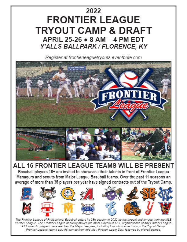 The Frontier League of Professional Baseball has announced that their 29th annual Tryout Camp and Draft will be held on Monday, April 25 and Tuesday, April 26 at Y’alls Ballpark in Florence, Kentucky.